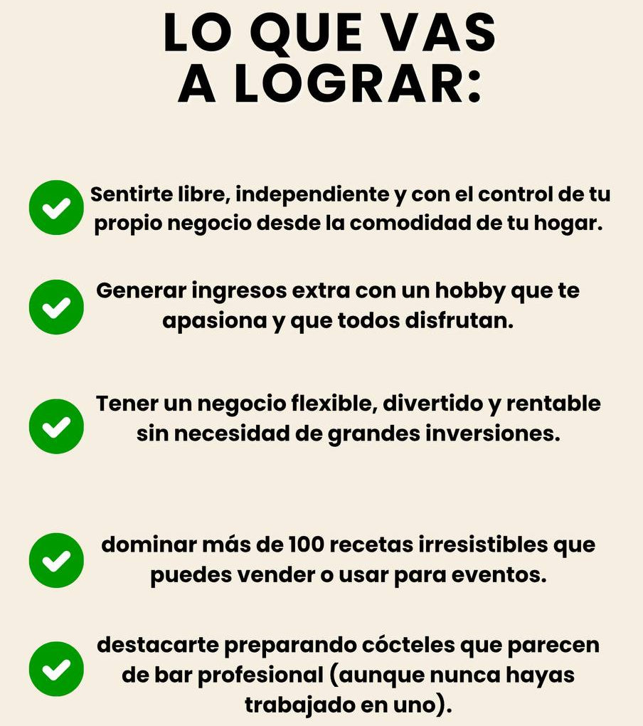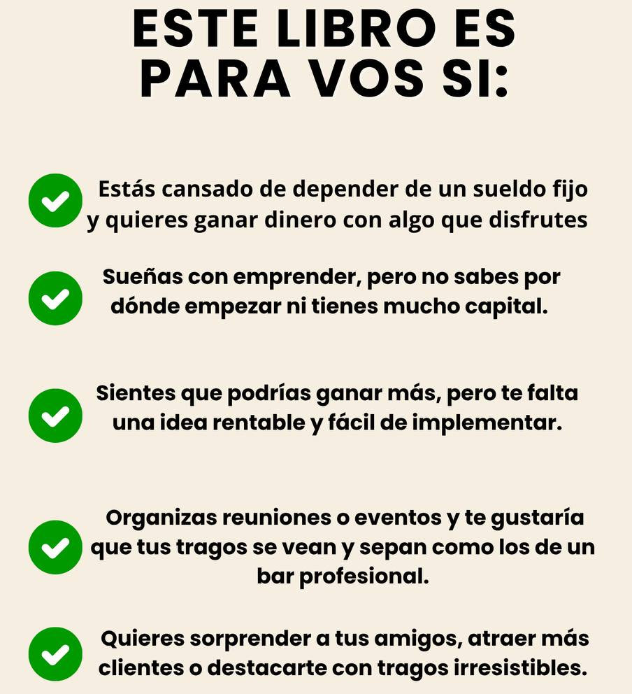 No te preocupes. El ebook incluye una sección sobre cómo empezar a ofrecer tus tragos, atraer clientes y poner precios sin miedo. Es ideal para quienes están dando su primer paso como emprendedores.